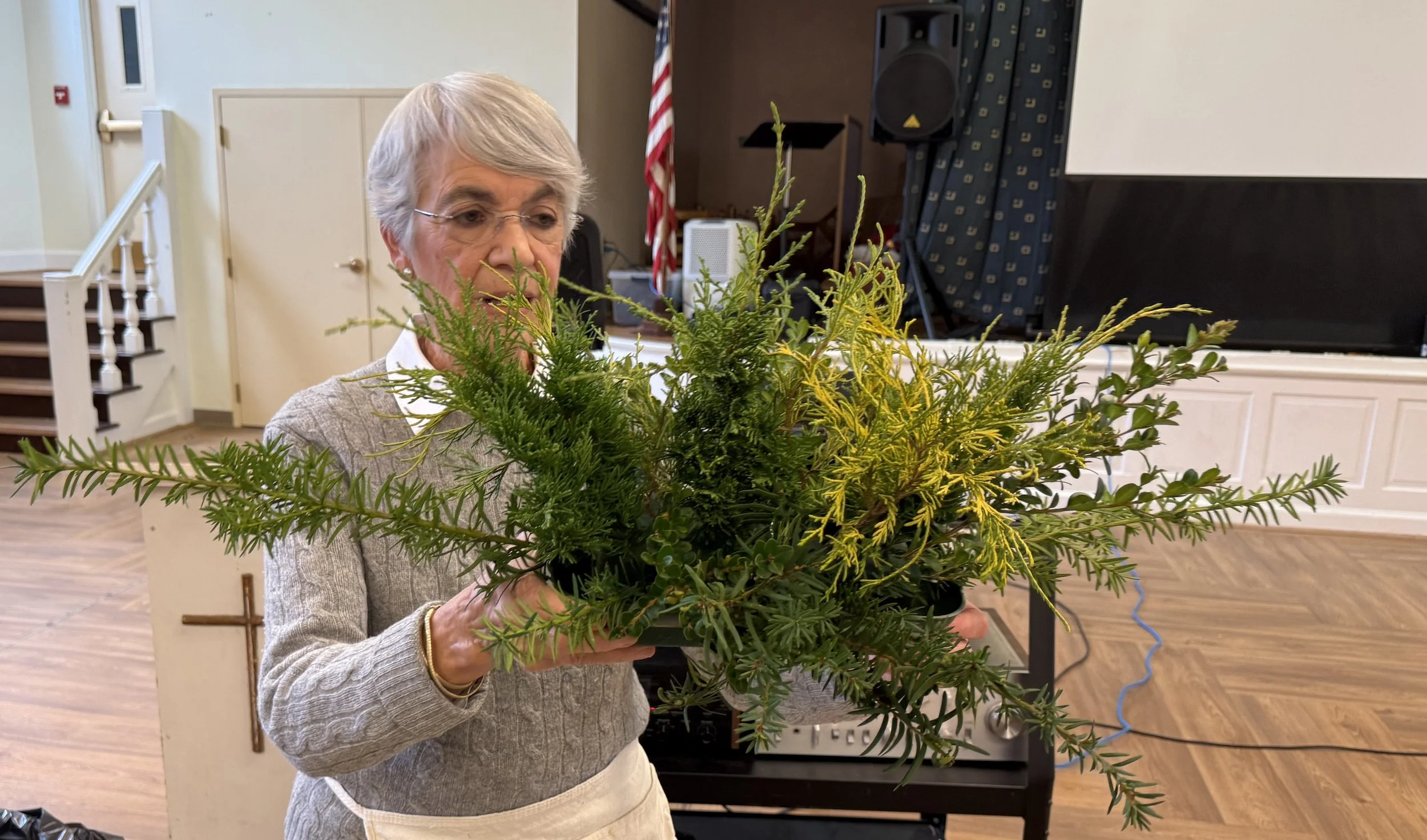 Mary Jo Gardill begins to look for other evergreens to continue with the design.