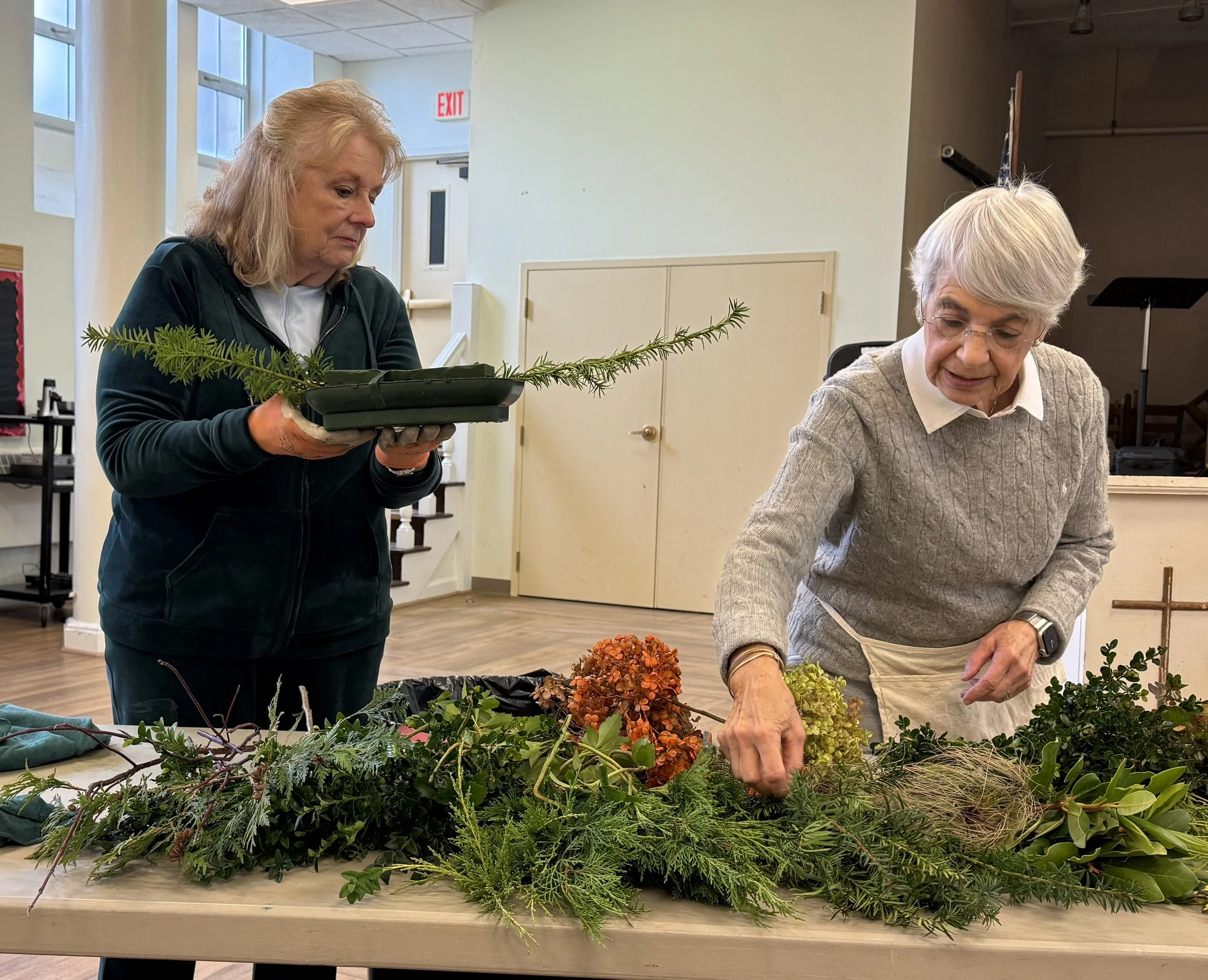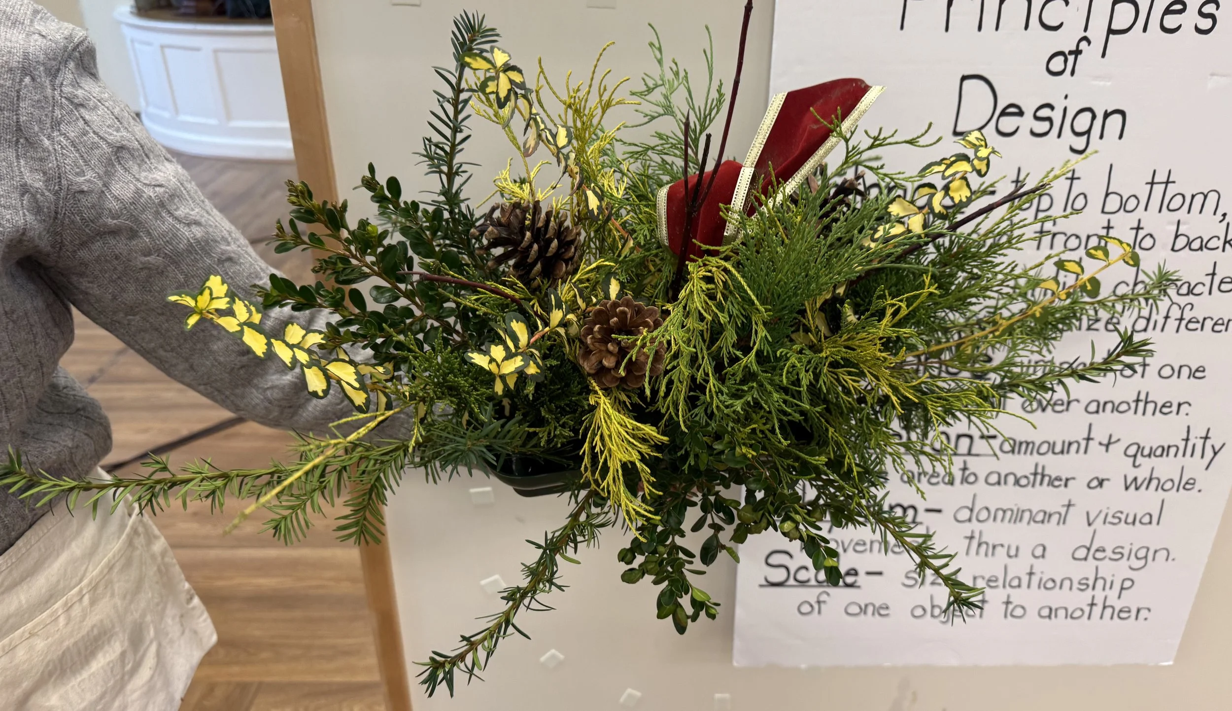 A workshop was held at the meeting to give instructions on making a design for multiple seasons. Because of the time of year, designs were focused on Thanksgiving and Christmas. Members were encouraged to bring evergreens from their yard. Examples are: holly, gold mop cypress, rhododendron, yew, arborvitae, euonymus, boxwood, and pachysandra. Dried hydrangea flowers, natural or sprayed a different color, can be used.