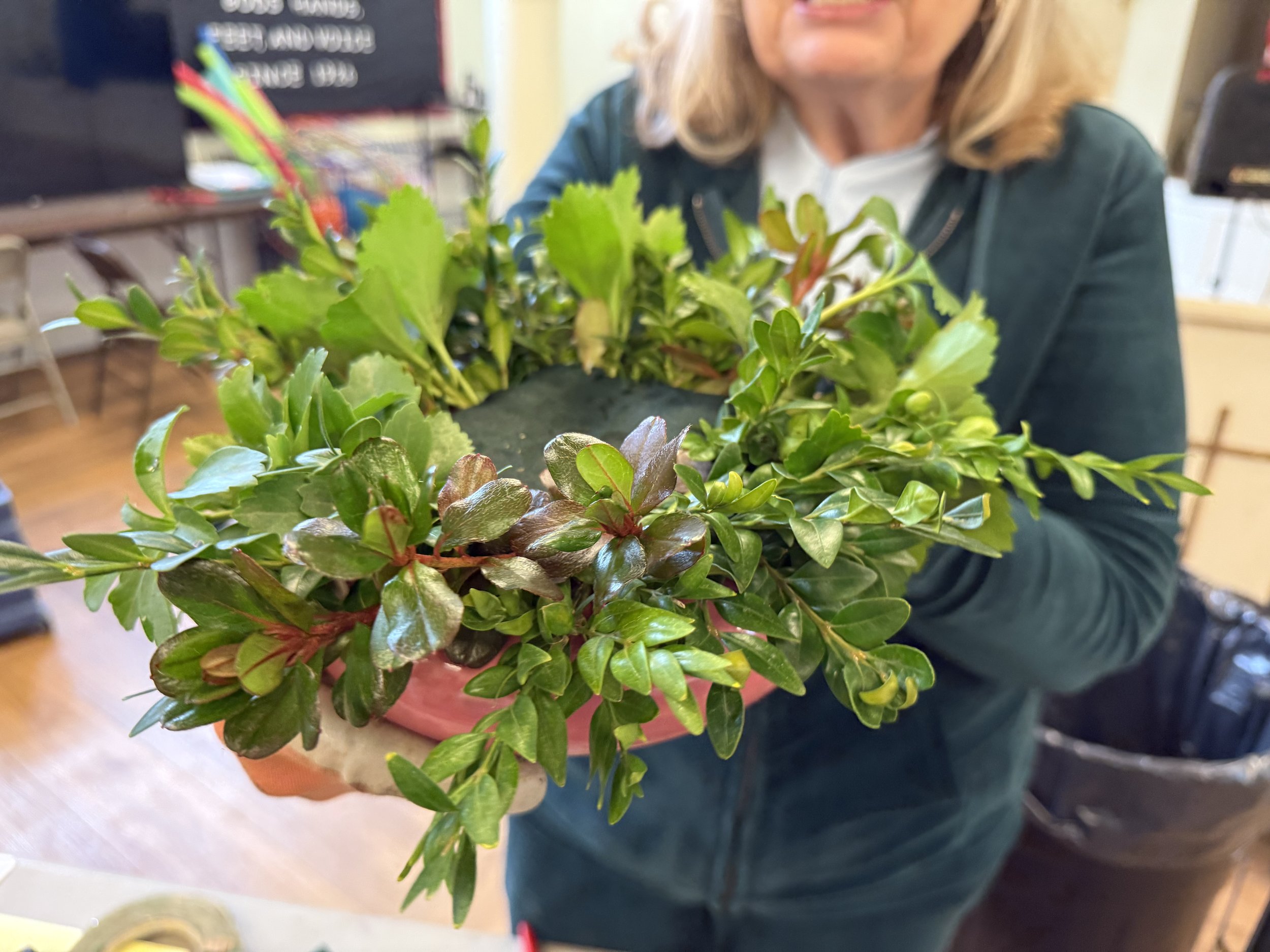 Charlotte started out by inserting pachysandra on the edge of the oasis near the rim of the container. She then added other evergreens with different shaped leaves, colors and textures.