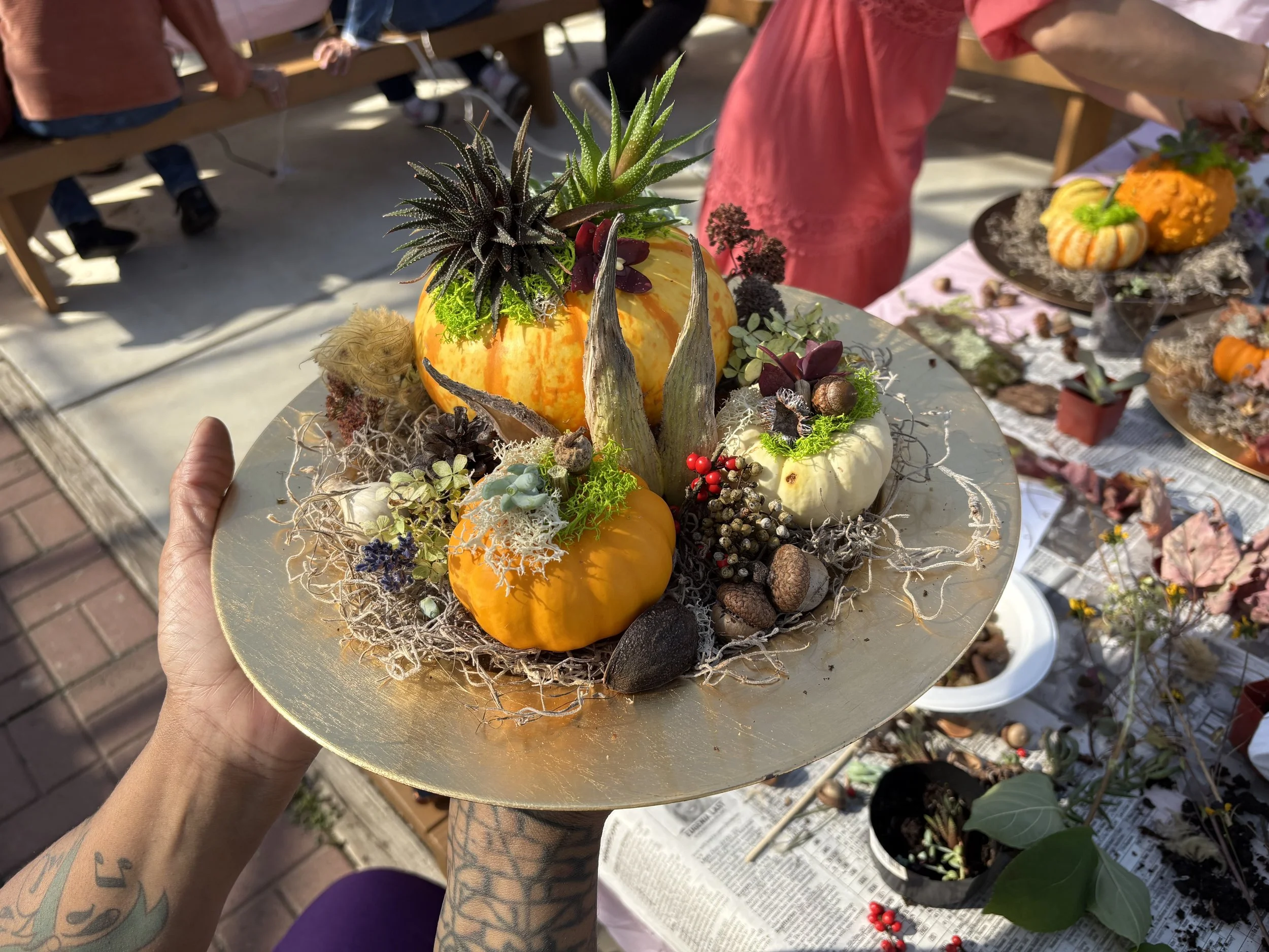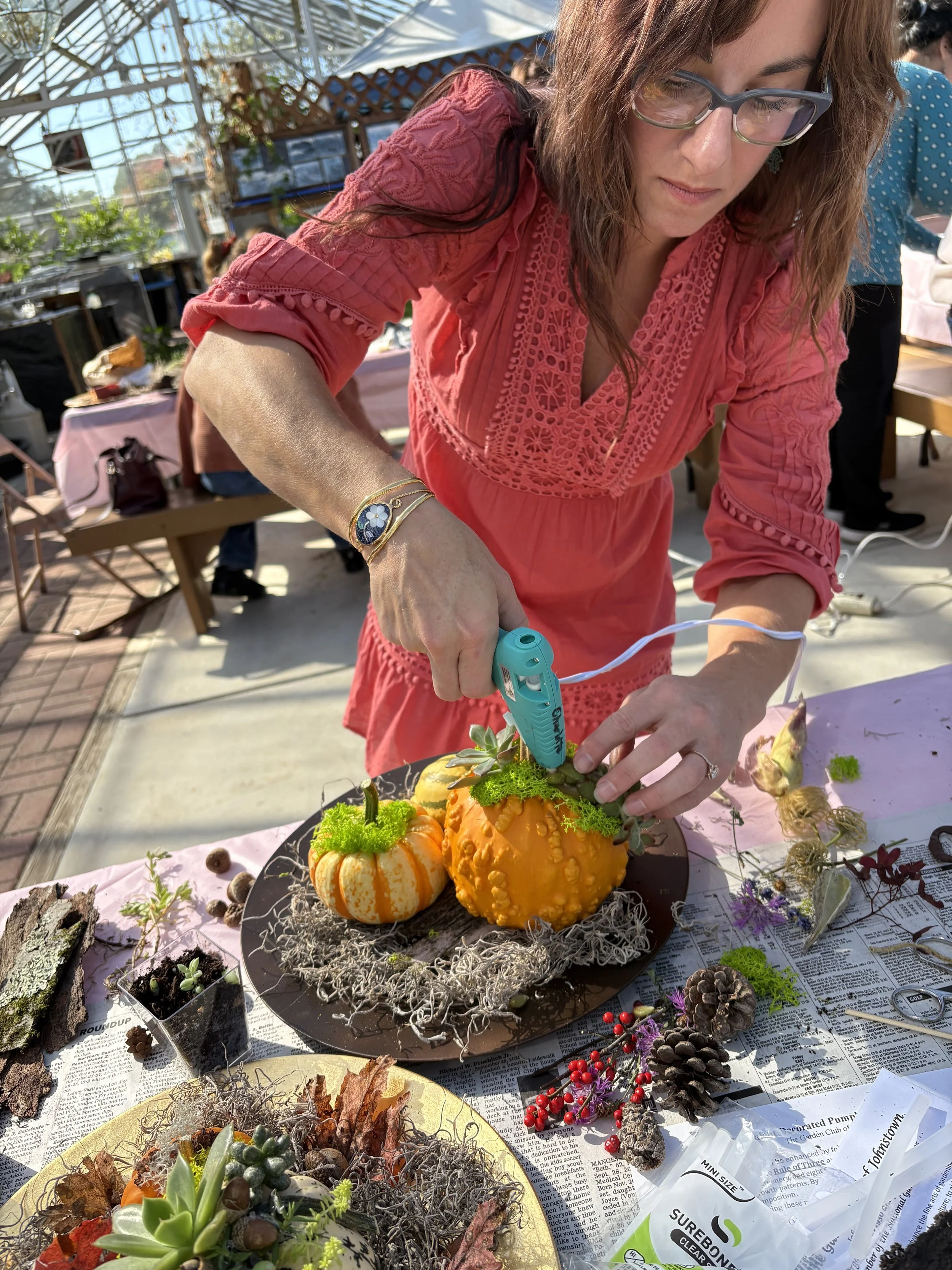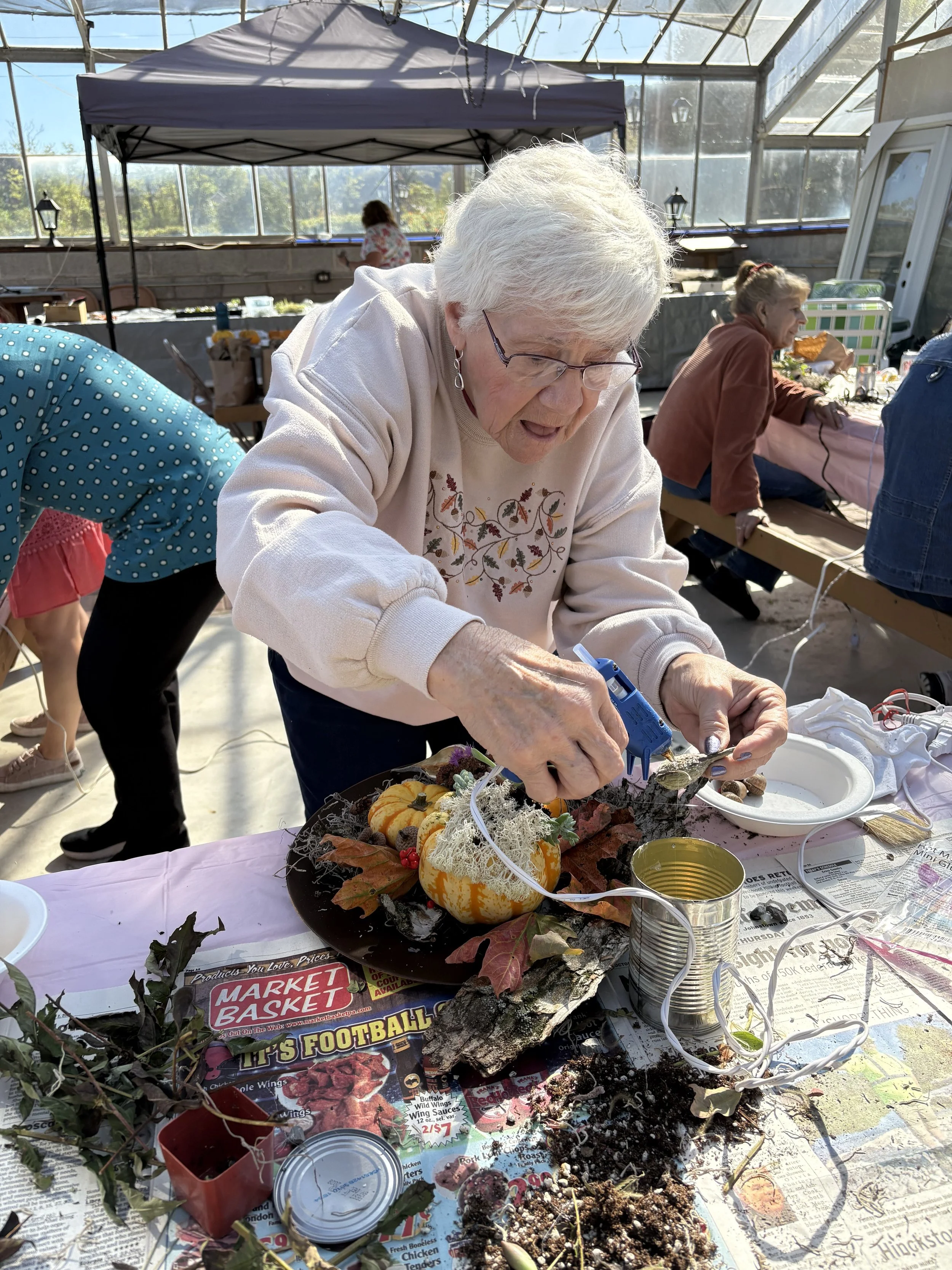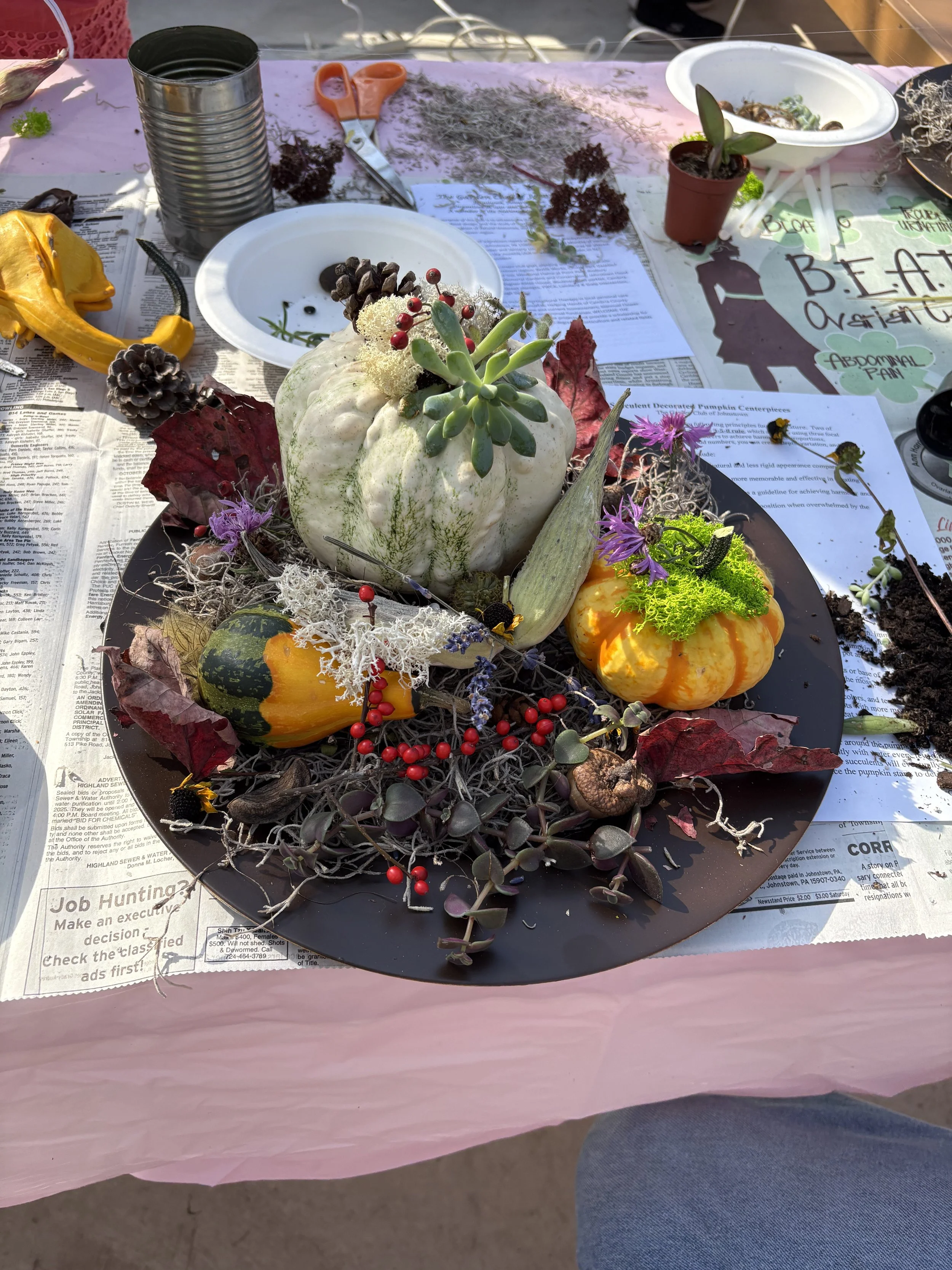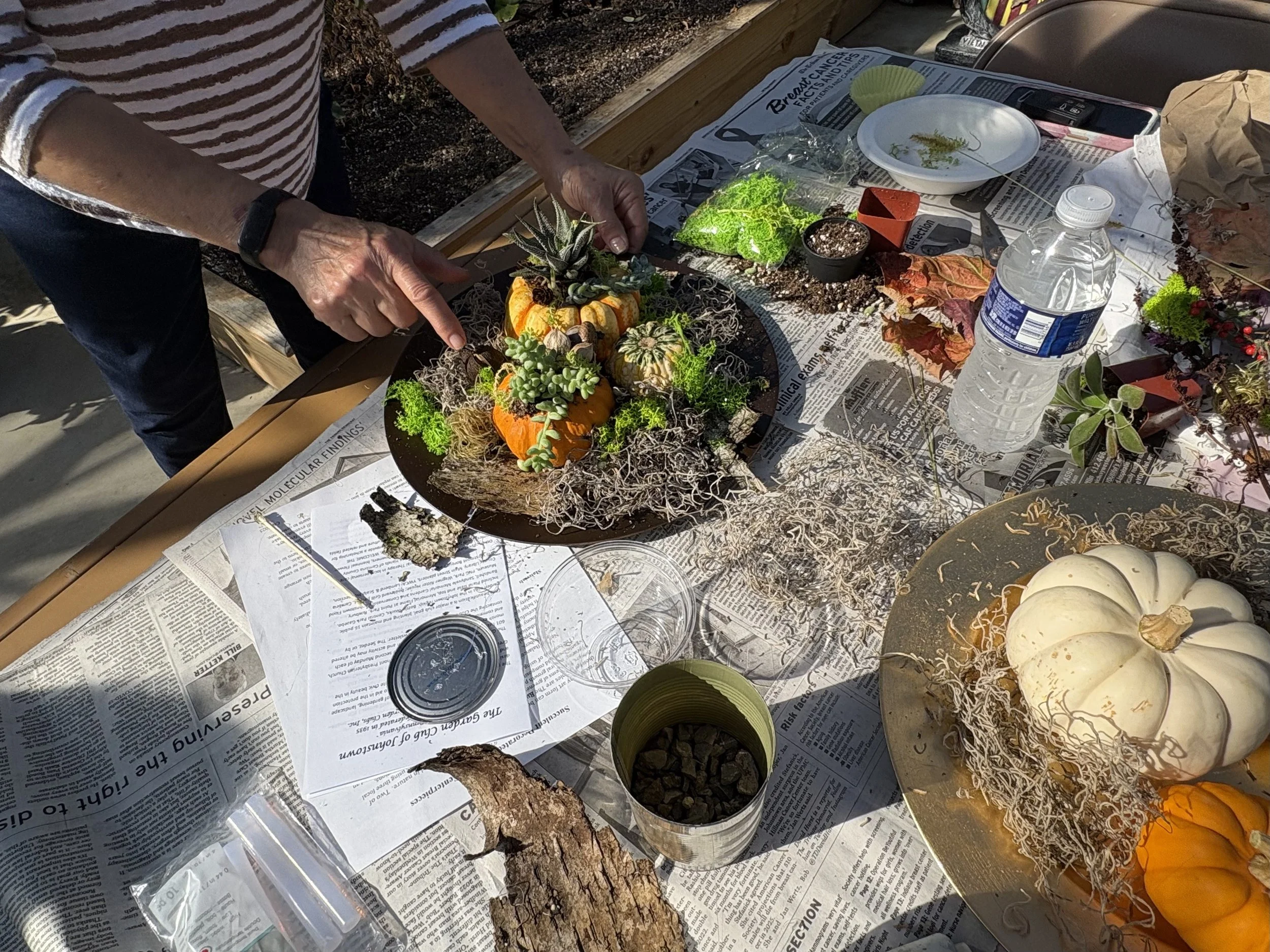 The Horticulture Therapy Committee did a workshop at Sandyvale Memorial Gardens and Conservancy and Dog Park for medical personnel and recovering/recovered patients. They made fall centerpieces using a trio or small pumpkins, gourds and accompanying natural elements.