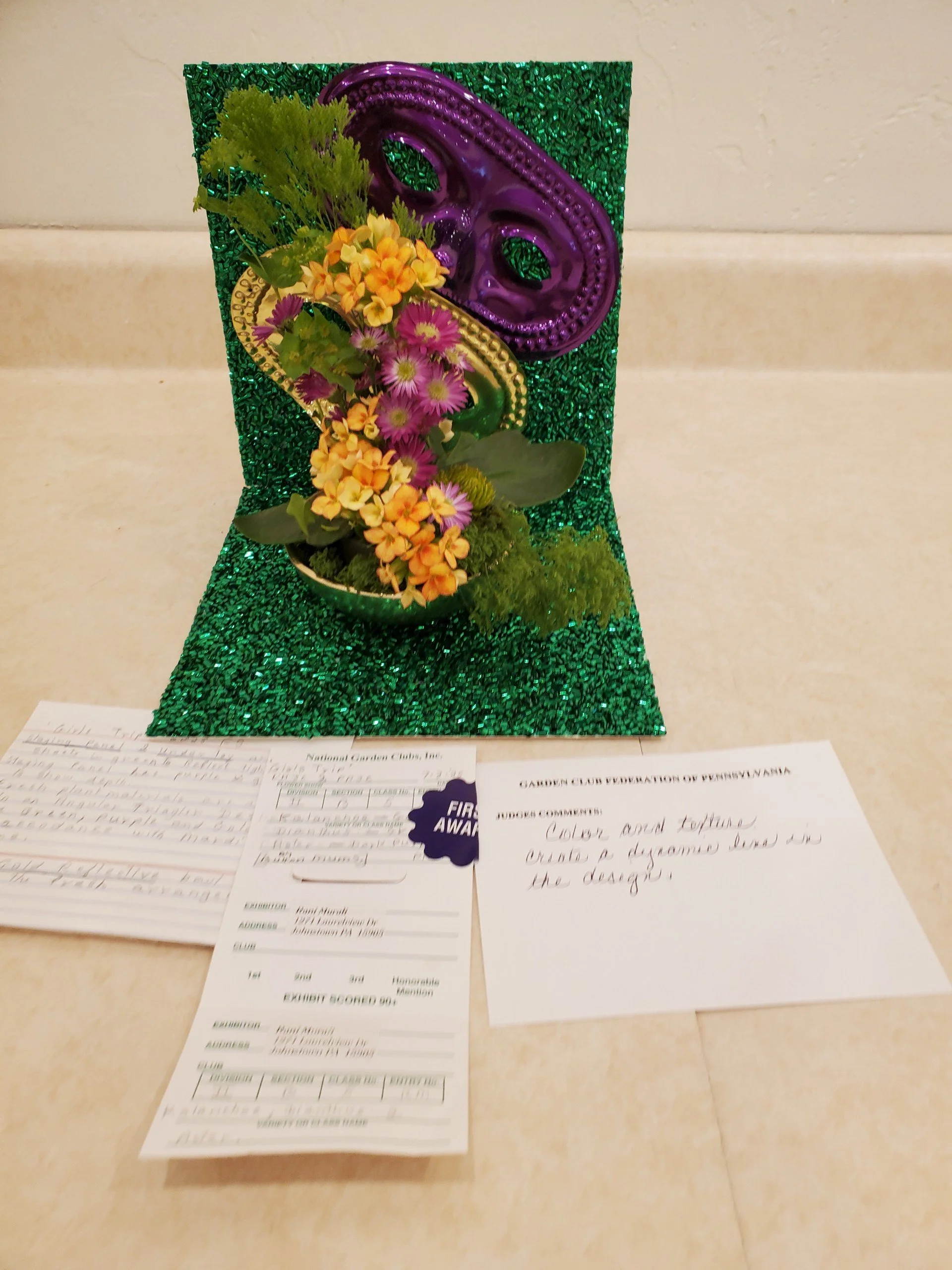 The Pittsburgh Area Judges Council and Laurel Highlands Judges Council held a NGC Standard Flower Show in Greensburg on Thursday, August 17 under the theme, “Dance With Me.” Each design was a reflection of different dances. Three of our members entered designs which are pictured below.