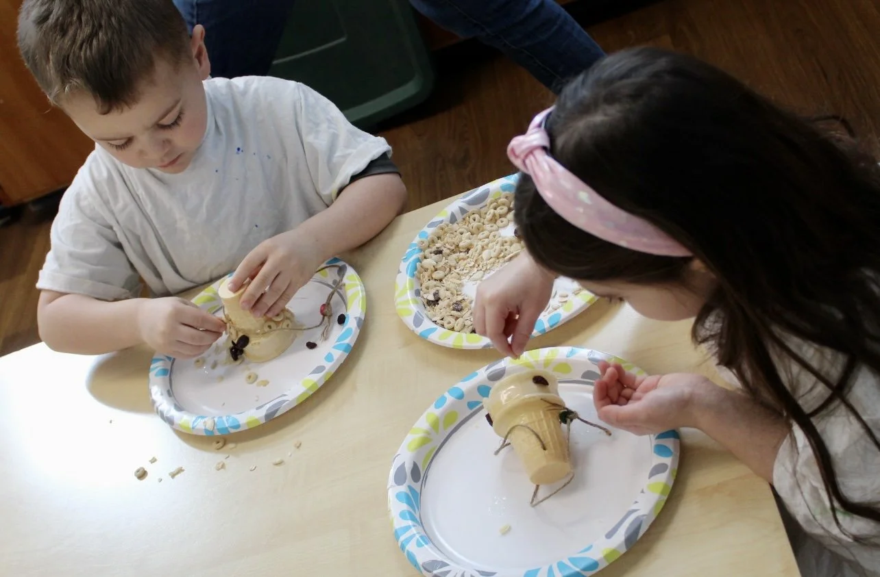 The three-year old preschool class enjoyed making their birdfeeders.